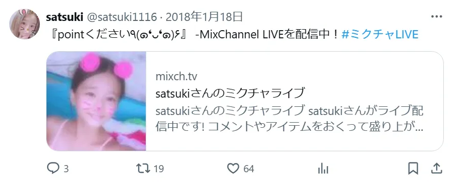 Twitterでミクチャ配信を宣伝していたことで、「さつき」アカウントの活動が一気に芋づる式で明るみに出た形となりました。